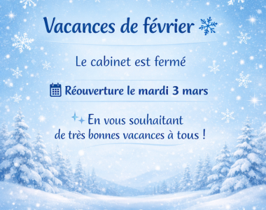 Le cabinet sera fermé du 11 ou 25 aout inclus. Très bonnes vacances d'Août à tous! 😎